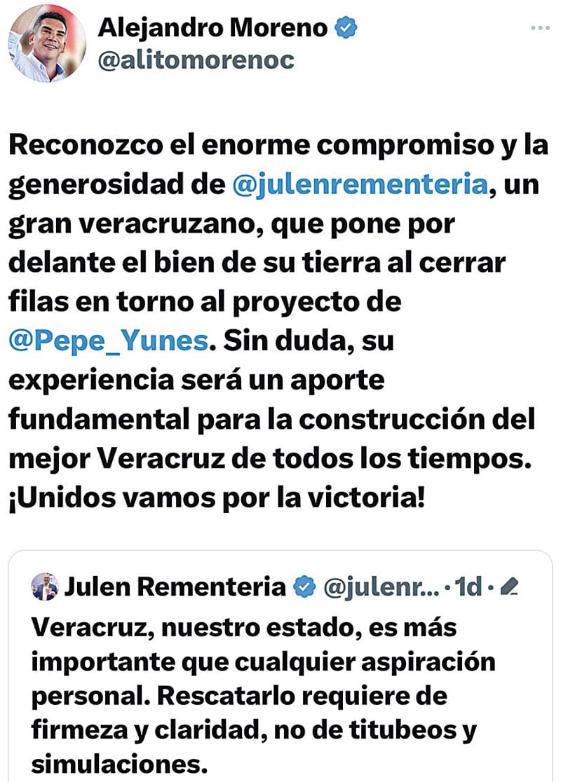 “Reconozco el enorme compromiso y la generosidad de Julen Rementería, un gran veracruzano, que pone por delante el bien de su tierra al cerrar filas en torno al proyecto de @Pepe_Yunes. Sin duda, su experiencia será un aporte fundamental para la construcción del mejor Veracruz de todos los tiempos. ¡Unidos vamos por la victoria!”.