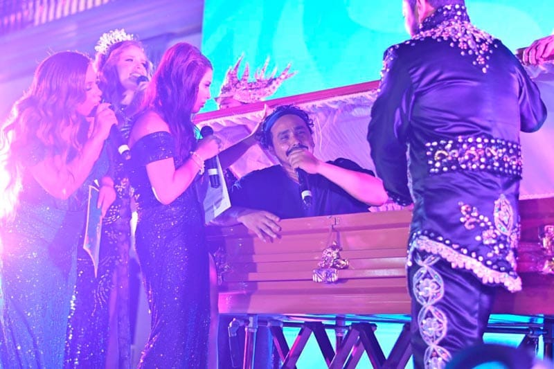 Ya en el escenario, se colocó el ataúd al centro mientras los integrantes de la Corte escenificaron el llanto y el duelo por la muerte simbólica de Juan Carnaval, en una representación cargada de humor y folclor.