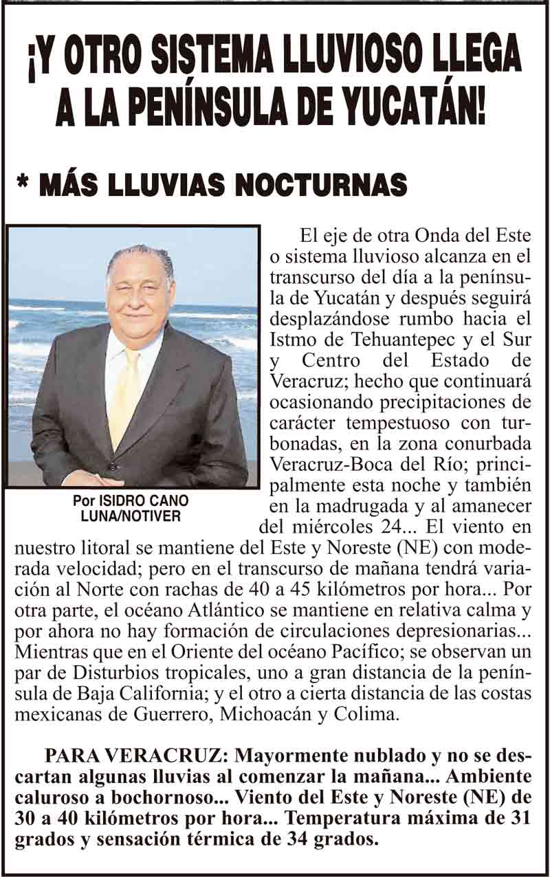 PRIMERA ¡Y OTRO SISTEMA LLUVIOSO LLEGA A LA PENÍNSULA DE YUCATÁN! - *MÁS LLUVIAS NOCTURNAS 23 julio 2024 Más Noticias ¡YA HAY TERNA! - RAÚL PEIMBERT EN LA LISTA ¡“CEMENTERIO”! - DE ULÚAS ¡INAUGURA PATY OTRA CALLE! ¡NO LE CREYERON! - Y LO BUSCAN NOTI-MEME | - ECOS DEL INFORME! ¡VERÓNICA VA CON NAHLE! - Y AL CONGRESO ¡“FAST TRACK”! - *Mientras el Mariner salía y entraba de Pajaritos en Coatzacoalcos ¡OPERATIVO LUPE-REYES! ¡MANDAN LA BILLETIZA! - *Corea manda 150 mil dólares ¡CRISTINA GANA LA ELECCIÓN!