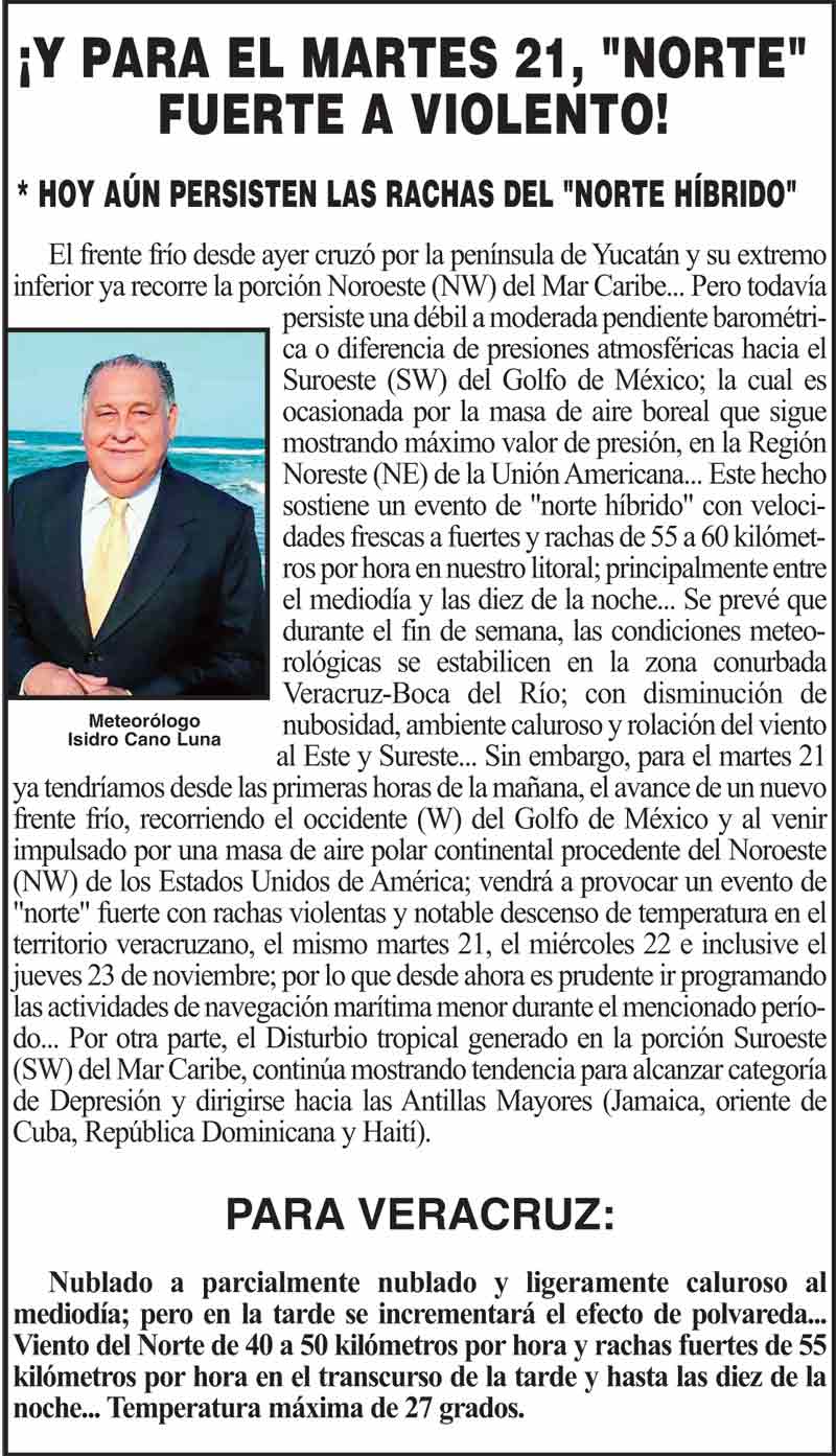 PRIMERA ¡Y PARA EL MARTES 21, "NORTE" FUERTE A VIOLENTO! * HOY AÚN PERSISTEN LAS RACHAS DEL "NORTE HÍBRIDO" 16 noviembre 2023 Más Noticias ¡ASESINAN A LUIS MARIO! - EN LERDO ¡HASTA EL 2040! - PA’SUMECHA ¡LLEGAN TONELADAS DE SARGAZO! - *A playas de Veracruz y Boca del Río, el mayor en 14 años ¡SERÁ OTRO EL WTC! - ÁNDALE ¡CORTARÁN EL AGUA! - *Por mantenimiento afectará colonias ¡VAN 5 REESTRUCURAS! - *De Fidel a Nahle ¡PLAZA FANTASMA! - AY NANITAS ¡ÚLTIMA HORA! ¡CHAMBEAN HASTA DE NOCHE! ¡PIDE TRANSPARENCIA! - MC
