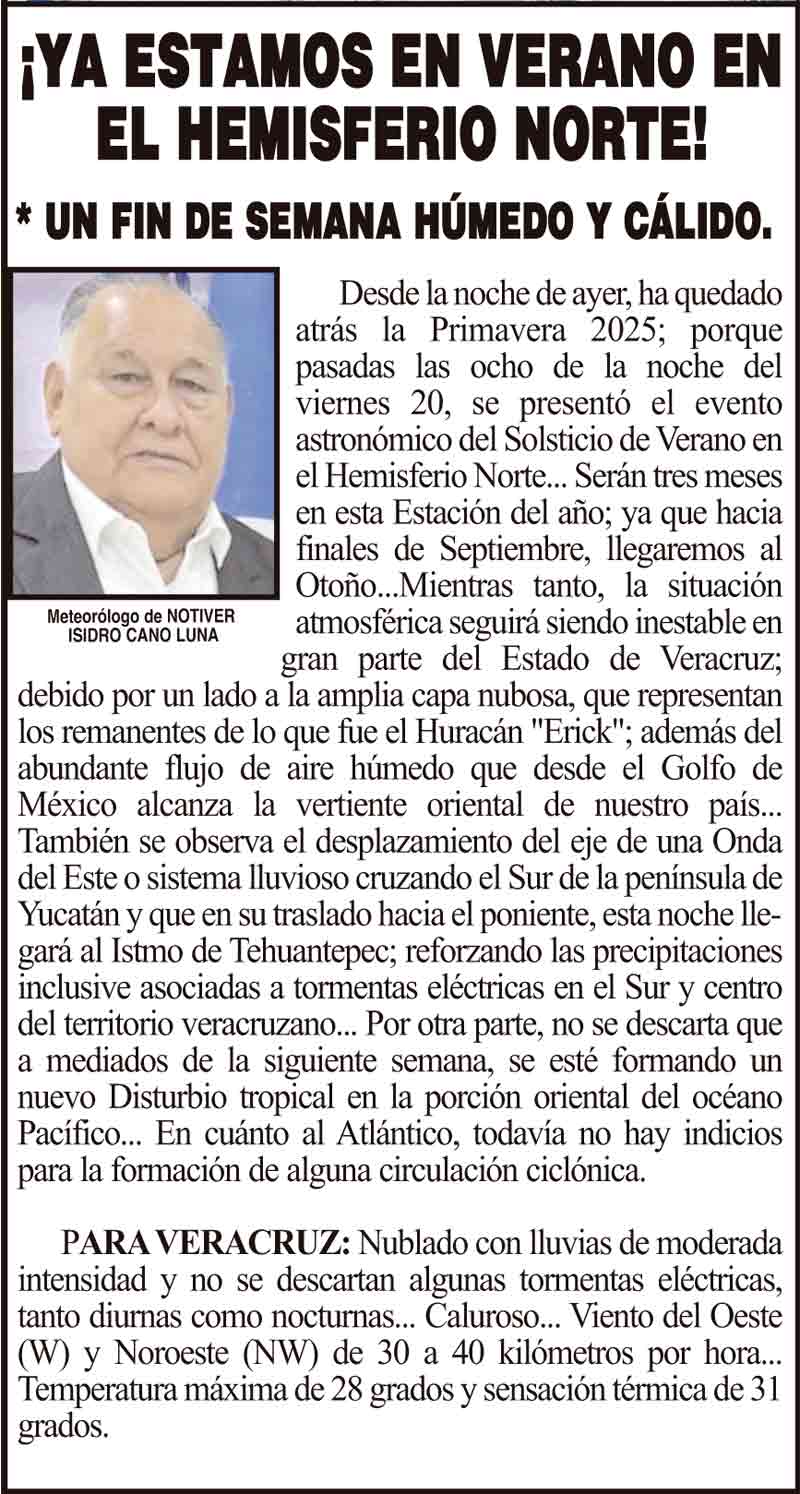 PRIMERA ¡YA ESTAMOS EN VERANO EN EL HEMISFERIO NORTE! - *UN FIN DE SEMANA HÚMEDO Y CÁLIDO... 21 junio 2025 Más Noticias LA PORTADA - VIERNES 5 DE DICIEMBRE 2025 ¡HOY SOPLA FRESCO Y DE FRENTE! - *PERO EL LUNES 8, ESTARÁ FUERTE Y CON LLUVIAS. LA ENCUESTA | - ME ESTÁS OYENDO INÚTIL?... ¡CON BAILONGOS QUIEREN AYUDAR A LOS DAMNIFICADOS DEL NORTE! - *El mismo Alor, toca los timbales ¡YA SE LA APROBARON! - REFORMA PARA LA FISCALÍA ESTATAL NOTI-MEME | - ASÍ ESTUVO EL INFORME... ¡MÁS DE 9 MIL MILLONES! - *Eso costaría cancelar en Veracruz al Grupo MAS ¡LE DAN LUZ VERDE! - DESDE GUATEMALA ¡EL CUARTO! ¡Y COM-PA-RE-CIÓ! - ÁNDALE...