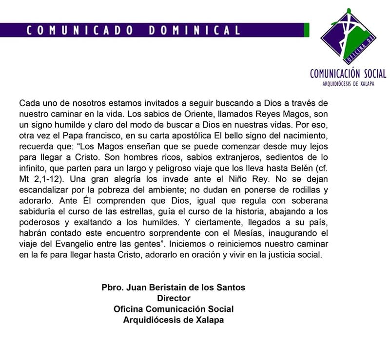 En su tradicional comunicado, la Iglesia dice que el Papa Francisco, en su carta apostólica El bello signo del nacimiento, nos recuerda y señala, con motivo de la Epifanía, la gran responsabilidad de dar a conocer a los demás el amor de Dios cuando ya lo hemos encontrado.
