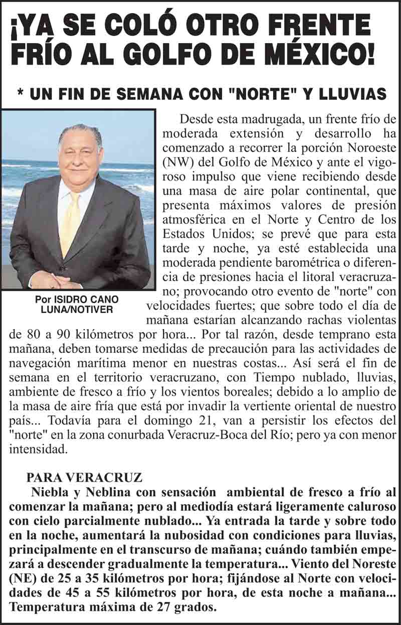 PRIMERA ¡YA SE COLÓ OTRO FRENTE FRÍO AL GOLFO DE MÉXICO! * UN FIN DE SEMANA CON "NORTE" Y LLUVIAS 19 enero 2024 Más Noticias ¡TENDRÁ LA MARINA SÚPER BARCOS! ¡CLONAN CARTEL DE RECOMPENSA DE LA FGE! NOTI-MEME | - LOS OTROS CARTELES! ¡HOMENAJE A FIDEL Y ROSITA! - DEL PRI ¡PASAN LISTA LOS ALCALDES! - *En la Heroica Escuela Naval, ahí estuvieron Maryjose, Beto Cobos y Rosa María ¡ISLEÑO SE QUEDÓ CON CAMIONETÓN! - *Capibara no sabía, pero sí la esposa del director de Tránsito, Andrés Delgado ¡EXIGEN JUSTICIA! - LA COMUNIDAD MÉDICA LOS CARTONES ¡LOS VAN A INVESTIGAR! - *A policías estatales que dispararon a la doctora ¡VINO CLAUDIA! - A LA GESTA HEROICA