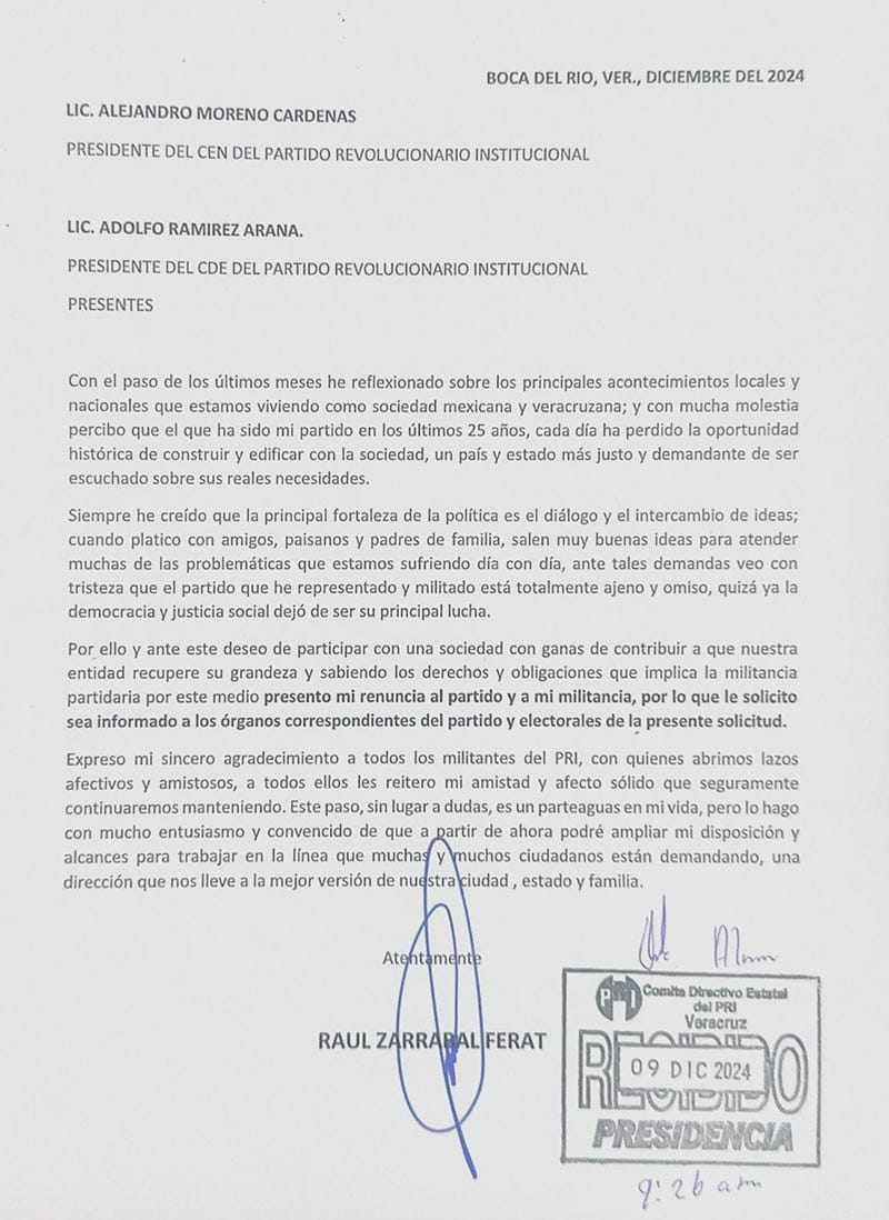Boca del Río, Ver. El político Raúl Zarrabal Ferat renunció a su militancia del PRI, luego de 25 años, en donde colaboró para los gobiernos estatales de Fidel Herrera Beltrán, de Javier Duarte de Ochoa, además, de que sirvió como regidor y diputado local.
