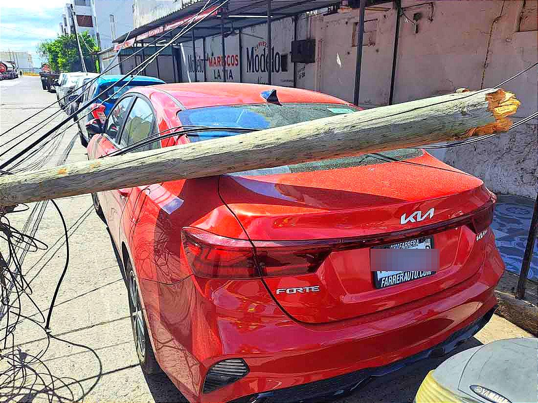 Esta tarde en calles de la colonia Manuel Contreras del municipio de Veracruz, se registró la caída de un poste de madera sobre un auto particular de la marca Kia y de color rojo. Por fortuna no hubo personas lesionadas, pero si lo daños en la unidad propiedad del señor Fernando Alberto S.B.