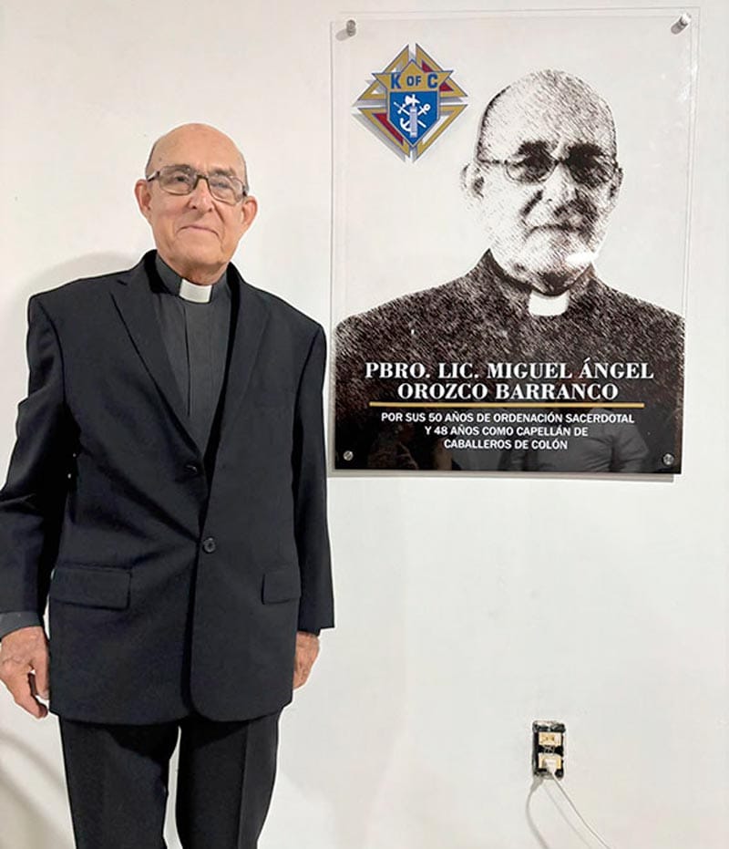 El Consejo de los Caballeros de Colón Veracruz, celebró una misa especial con motivo de los 50 años de sacerdocio del Padre Miguel Orozco Barranco, amigo y guía espiritual de dicha Orden; asimismo, el Gran Caballero Alejandro Morales Pulido, develó la placa conmemorativa que honra su vocación de cinco décadas de sacerdocio y 48 años como Caballero de Colón, siendo Capellán.