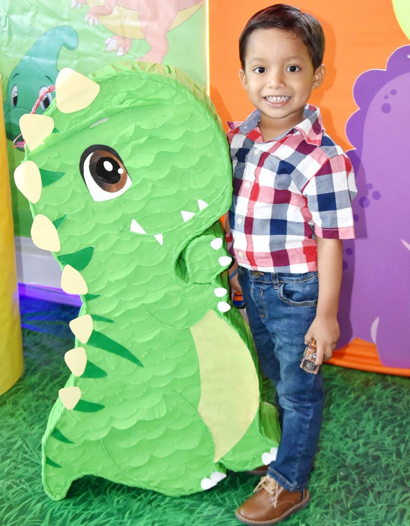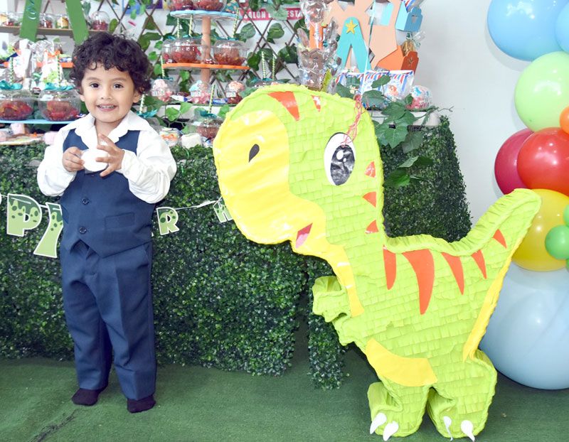 El festejado con una linda sonrisa recibió a sus queridos invitados, quienes lo felicitaron y le hicieron entrega de muchos regalos, así mismo se asombraron de lo hermoso que se encontraba decorado el lugar, el cual tenía un toque mágico salvático, en donde se encontraban varias especies de Dinosaurios, posteriormente los pequeños corrieron a divertirse en los juegos, las animadoras organizaron varias dinámicas haciéndolos partícipes de sus aventuras, acto seguido fue servido un delicioso menú, acompañado de postres y finas bebidas, para luego dar paso a las piñatas, en donde el primero en pasar fue el anfitrión y sucesivamente sus compañeritos.