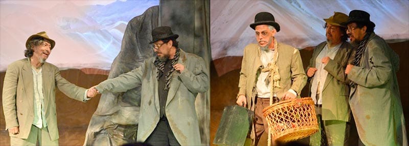 Por orden de aparición, los actores que participan son: Manuel Casal/Gogo, Arturo Toral/Didi, Juan Pablo Solano/Lucky, José María Mendiola/Pozzo y Luis Alejandro Peregrina/Mensajero… en escena, una pareja de vagabundos pasan los días esperando, se hacen preguntas fundamentales, comen raíces, se desorientan, se animan, canalizan toda su energía en una sola acción: sobrevivir.