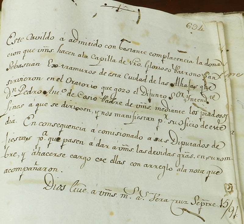 “Donde se pide sacar al santo ya que la ciudad está asolada por una epidemia de viruela. Encontramos documentos que refieren a los gastos que se hacen para el mantenimiento de la capilla: pintura, reparación de ventanas, carpintero, lo que permite ir entendiendo el interés que había por mantener en buen estado la capilla; hay documentos de donación de familiares de algún habitante distinguido de la ciudad que moría, para que el santo intercediera por el difunto, daban diversos objetos. También hay un inventario donde se desglosa lo que había en la capilla: cáliz de plata, casullas sacerdotales, alhajas, elementos litúrgicos u ornamentales que permiten entender que era un santo muy socorrido, ya que quien promovía el culto era el Cabildo, que estaba integrado por los ciudadanos distinguidos de cada ciudad”.