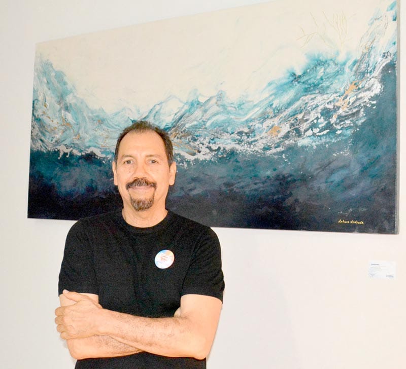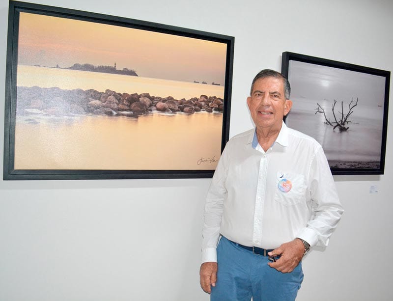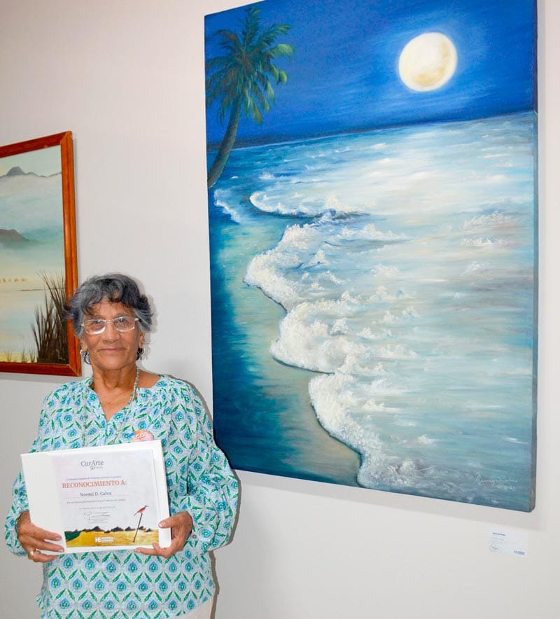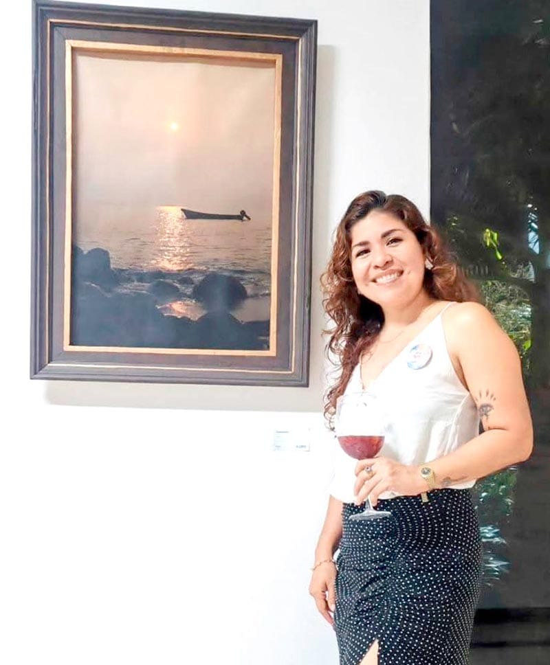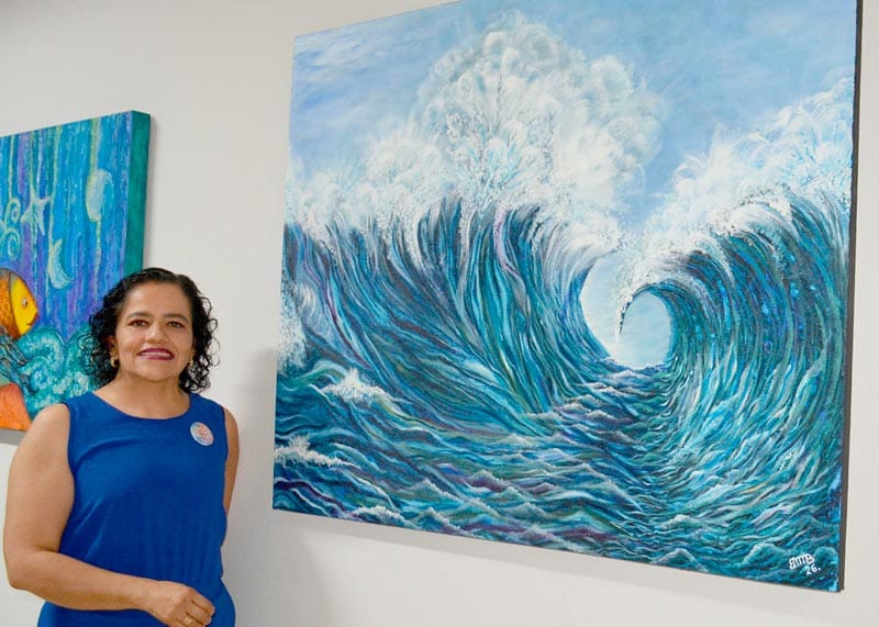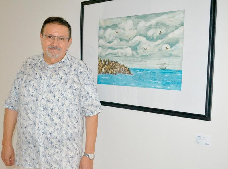 Las obras evocan aves marinas atravesando cielos inciertos, embarcaciones en pausa frente al horizonte, la presencia casi mítica de la Isla de Sacrificios y la resistencia silenciosa de las escolleras ante el oleaje.