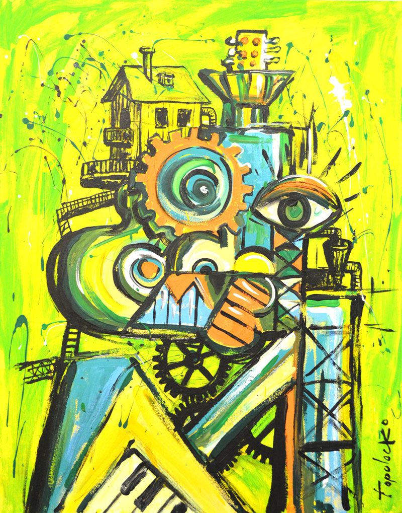 Con el colorido brillante que forma parte de su sello personal y explorando nuevas gamas metálicas en bronce y oro, evocando a las máquinas, Héctor Pineda “Topolocko”...