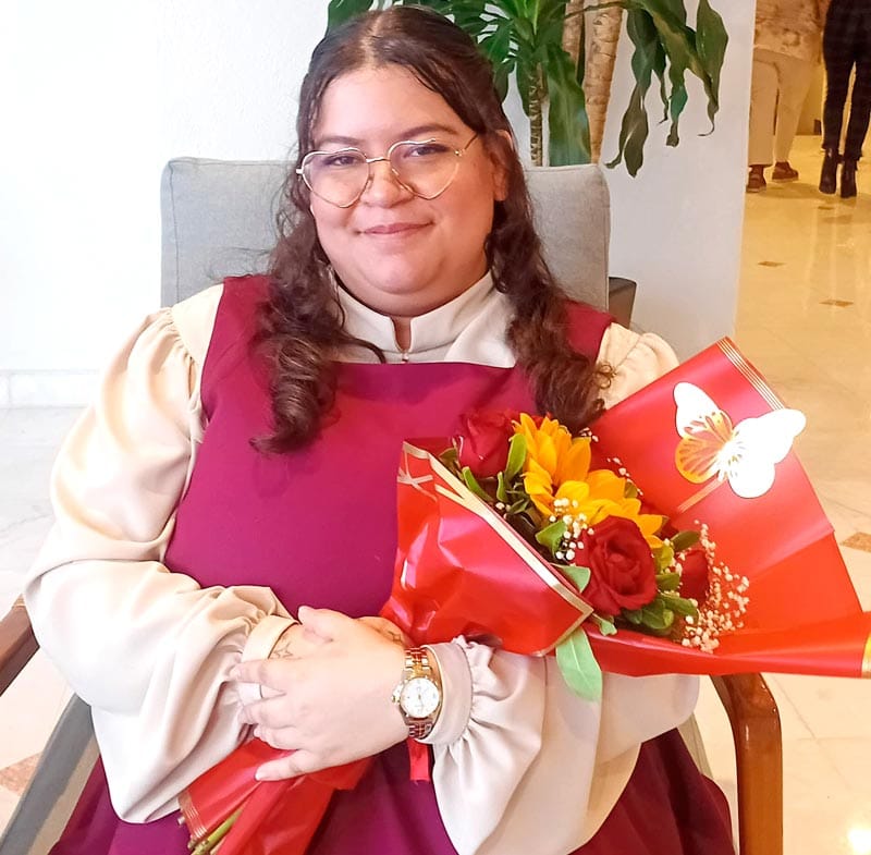 Frida comenzó su exposición en inglés, después lo hizo en francés y finalizó la reflexión en alemán, obteniendo el reconocimiento inmediato de asistentes y de sus orgullosos padres: Norma Lagunes Fernández y el abogado Alfredo Espejo Barradas, y su hermano Alfredo Espejo Lagunes.