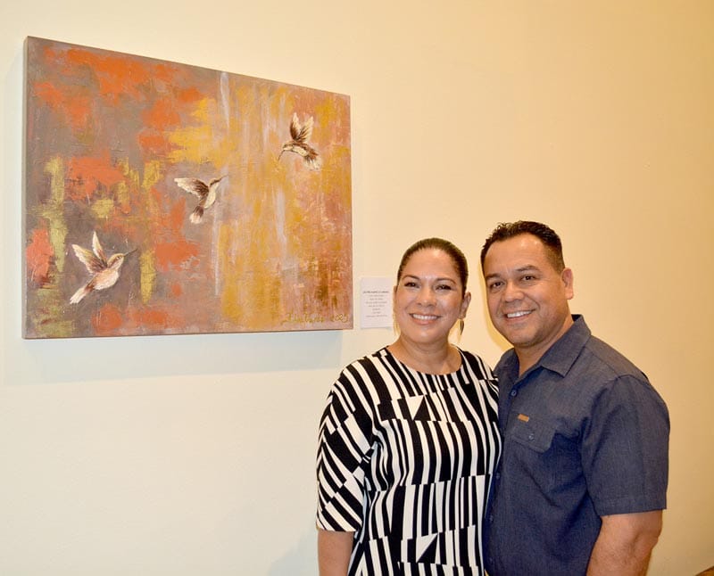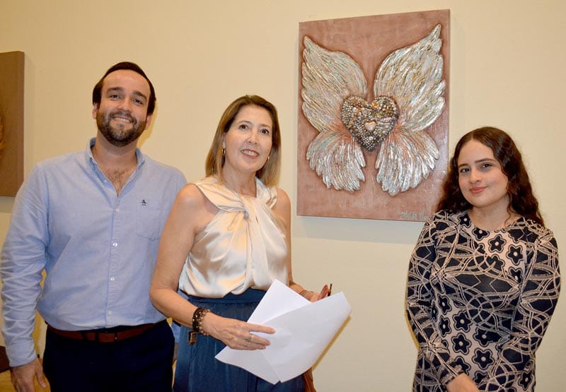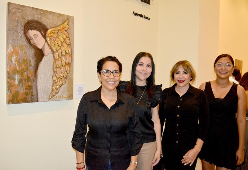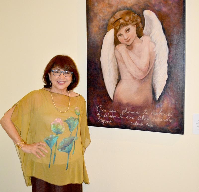 “'El Ángel del Salmo 91' fue el primero que pinté en 2008, me estoy despidiendo de él, espero se venda; hay uno de tres colibríes, realmente son tres personajes que me formaron que son mis dos abuelas y mi mamá”.