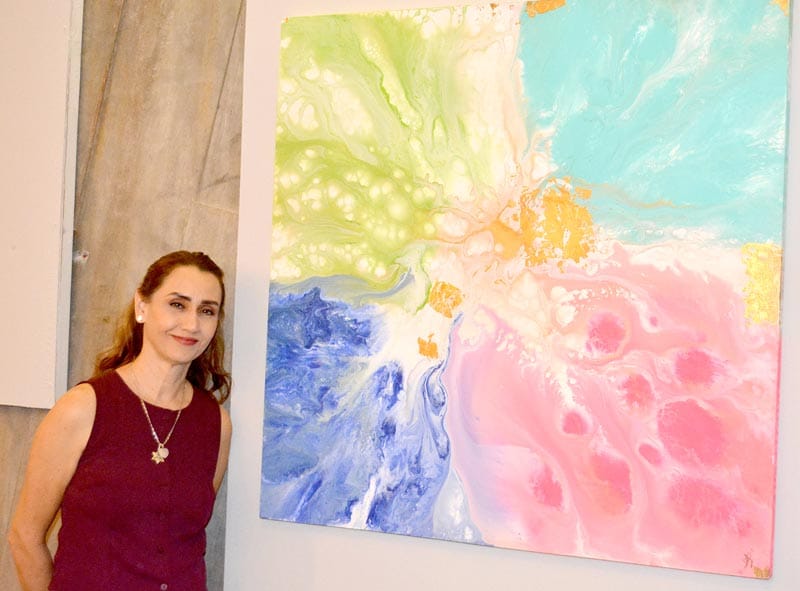 Explica Iovana, cuya obra abstracta está hecha en formato mediano y grande, en acrílico fluido, con una variada y muy bien lograda gama de colores brillantes y vibrantes que se dispersan, logrando distintas formas.