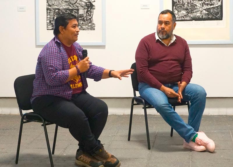 Julio Torres durante su conversatorio “El viento se quiebra en nuestros hombros”, explicó la conexión entre el arte y la historia, compartiendo sus influencias, entre las que destaca la figura del filósofo Walter Benjamin; expuso su proceso de investigación y las referencias estéticas que ayudaron a crear el trabajo que actualmente se exhibe en Casa Principal, el cual fusiona diseño, historia y lenguaje artístico.