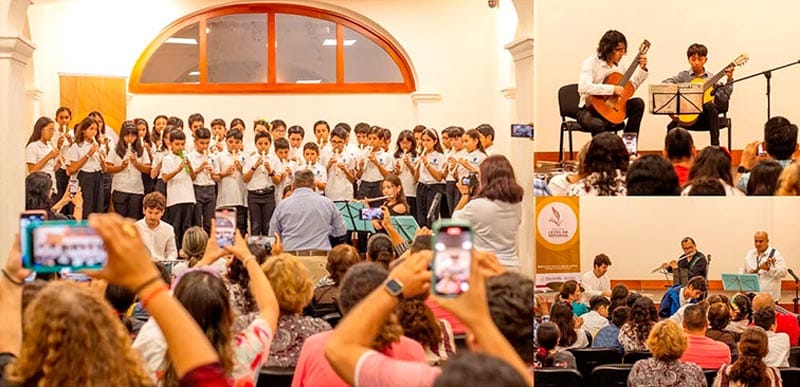 El Ensamble de Guitarras, dirigido por el maestro Jorge Benjamín González Melo, y el Coro de Flautas, bajo la batuta del maestro Javier Concepción Cruz, están conformados por niñas y niños de entre 8 y 12 años, que este mes finalizan los cursos que han tomado en el CIMI Veracruz, como parte de su proceso de iniciación musical.