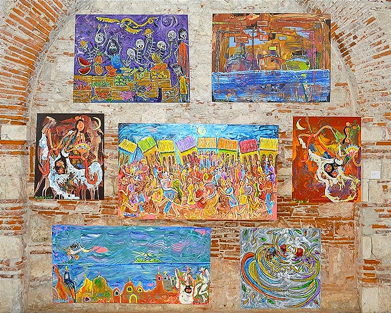 Jarochos, mariachis, folklore, costumbres y tradiciones mexicanas; barcos, el mar, la flora y fauna, son representados a través de las pinceladas del creador.