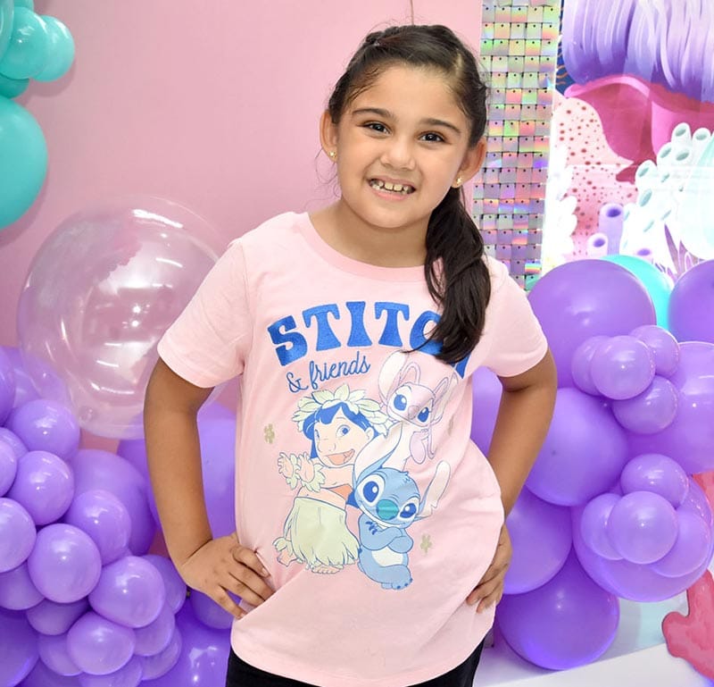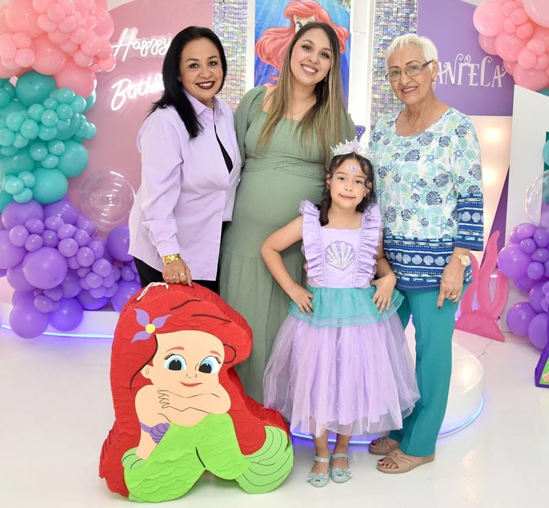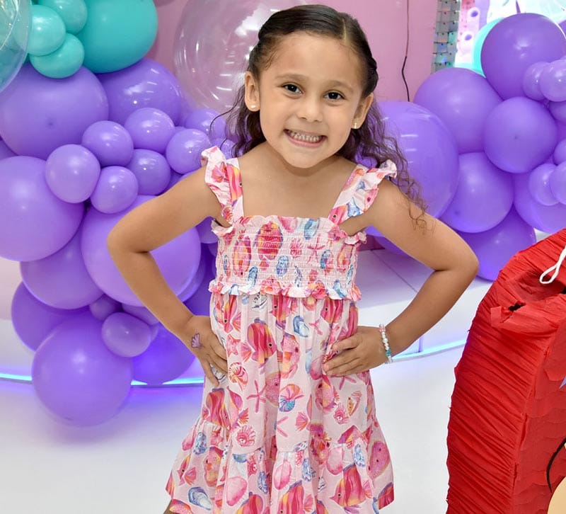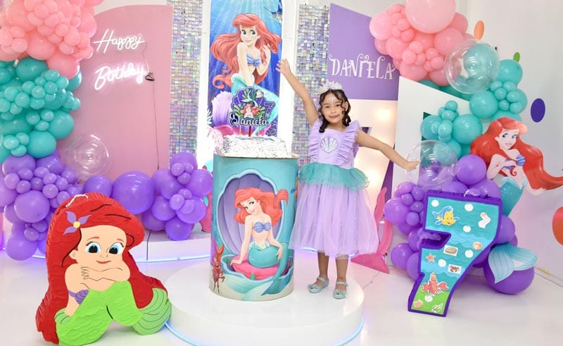Alrededor de 150 invitados colmaron de buenos deseos y regalos a la festejada, quien sopló siete velitas de su pastel de cumpleaños, decorado en tonos azul, verde, morado y rosa, con detalles del mar y una figura de La Sirenita.