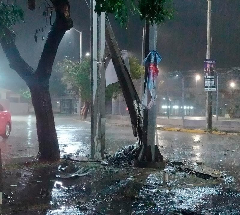 *En el lugar fue hallado también una luminaria ladeada, esto a causa del impacto de la camioneta de marca Jeep