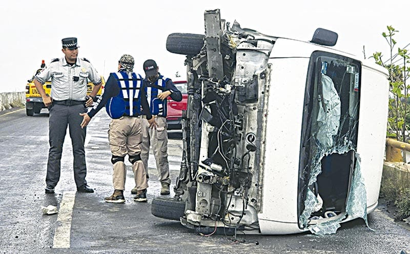 En el puente de Paso del Toro-Medellín de Bravo, un hombre en una camioneta, tipo Urban, se estrelló contra el barandal de acero y concreto, quedando volcada la unidad y el operador con lesiones, luego de pasar por un charco de agua.