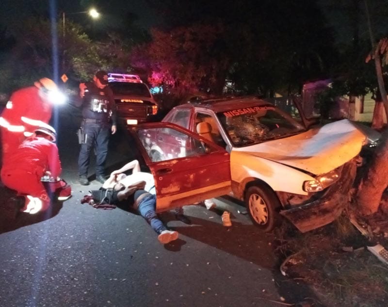 En la colonia Pocitos y Rivera en la ciudad de Veracruz, un automóvil, de la marca Nissan, tipo Tsuru, se estrelló contra un árbol del camellón, resultando sus tres ocupantes lesionados, al ir en presunto estado etílico, movilizándose los cuerpos de emergencia y agentes de vialidad.