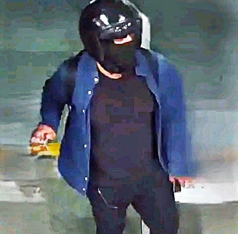 Nunca se quita el casco protector, sólo levanta el visor para ver mejor y saca un arma de fuego tipo escuadra, con la cual amaga a los empleados del mostrador, y exige el dinero de la caja registradora, y de inmediato se da a la fuga en una moto estacionada afuera.