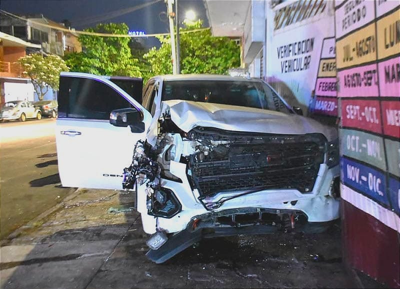 Por su parte, la camioneta GMC, tipo Denali, acabó en la esquina contraria, pegándole a un portón del verificentro.