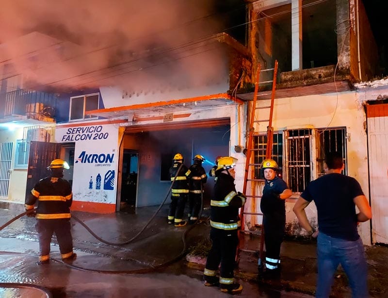 El fuego consumió el taller mecánico "Servicio Falcón 200", ubicado en la calle Carlos Cruz, entre Revillagigedo y Pino Suárez, lo que obligó a la rápida intervención de los bomberos del municipio de Veracruz.