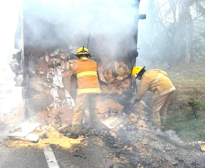 Un tractocamión cargado con alimento para pollo se incendió la madrugada del jueves sobre la carretera federal Las Choapas-Ocozocoautla, a la altura del kilómetro 75+000, en el municipio de Las Choapas, sin reporte de lesionados.