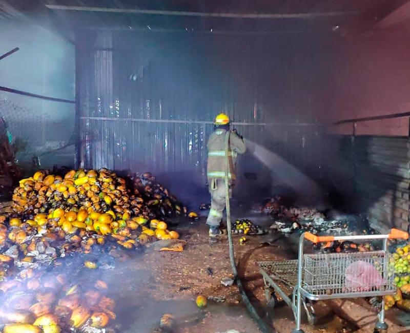 Durante casi dos horas, bomberos lucharon por controlar el fuego en locales de venta de frutas, verduras y mercancía de abarrotes, hasta que finalmente el incendio quedó sofocado.