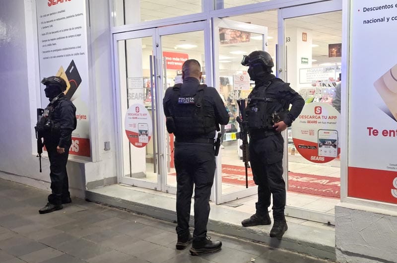 Policías de la SSP, así como militares de Marina y de la Policía Naval, con detectives de la Policía Ministerial instrumentaron un operativo en busca de los asaltantes que usaron siete minutos para atracar Sears, pero sin éxito pues no han sido detenidos.