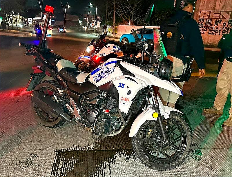 Uno de los preventivos Municipal de Boca del Río para evitar ser herido, se derrapó intencionalmente, cayendo en el pavimento y quedando golpeado.