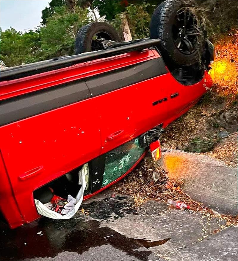 A la altura del entronque con la autopista México-Tuxpan, Óscar “N” perdió el control de la Dodge Ram y volcó en el acotamiento, quedando la camioneta con las llantas hacia arriba.