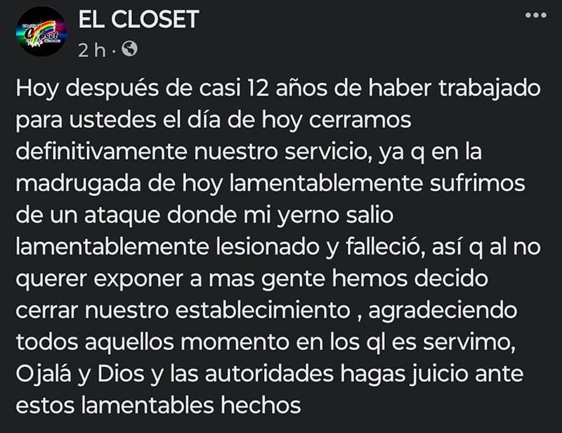 El estudiante Guillermo N.M. fue asesinado de un balazo en el abdomen a las puertas del bar El Clóset, sobre la carretera federal Tlapacoyan-Martínez de la Torre, poblado Rojo Gómez, el crimen ocurrió la madrugada del miércoles.