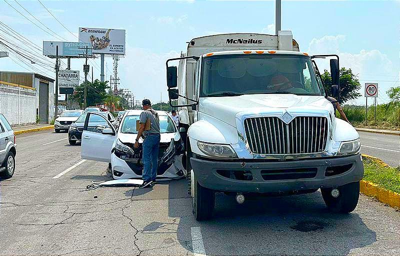 Un camión recolector de basura colisionó contra un carro compacto, tipo March, sobre la avenida Miguel Alemán, al sur de la ciudad de Veracruz, dejando daños materiales y a la intervención de personal de vialidad.