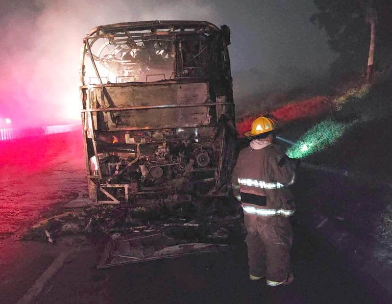 Amatlán de los Reyes, Ver.(AVC).- Un autobús de turismo terminó envuelto en llamas y consumido por completo sobre la autopista 150D Veracruz–Córdoba, a la altura del kilómetro 299, luego de que se incendiara presuntamente por un cortocircuito en el área del motor.