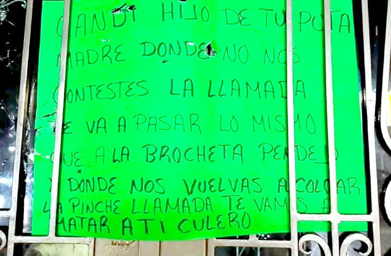 El texto indicaba... “Candi, hijo de tu puta madre, donde no nos contestes la llamada te va a pasar lo mismo que a La Brocheta, pendejo, pero donde nos vuelvas a colgar la pinche llamada, te vamos a matar a ti, culero”.