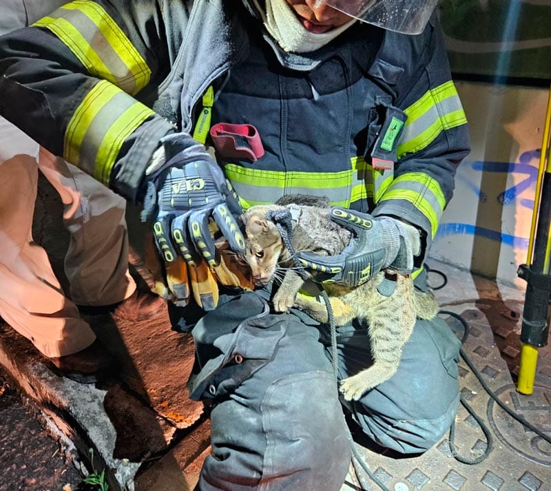 Los elementos de Bomberos Municipales de Veracruz lograron rescatar a un gato de ocho meses, de nombre Moka, que se había quedado atorado adentro de un registro de la CFE.
