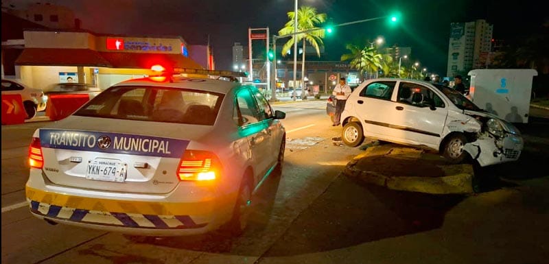 Del impacto, carro marca Pontiac, tipo Matiz, de color blanco acabó trepado sobre la guarnición, frente al Tianguis de Boca del Río.