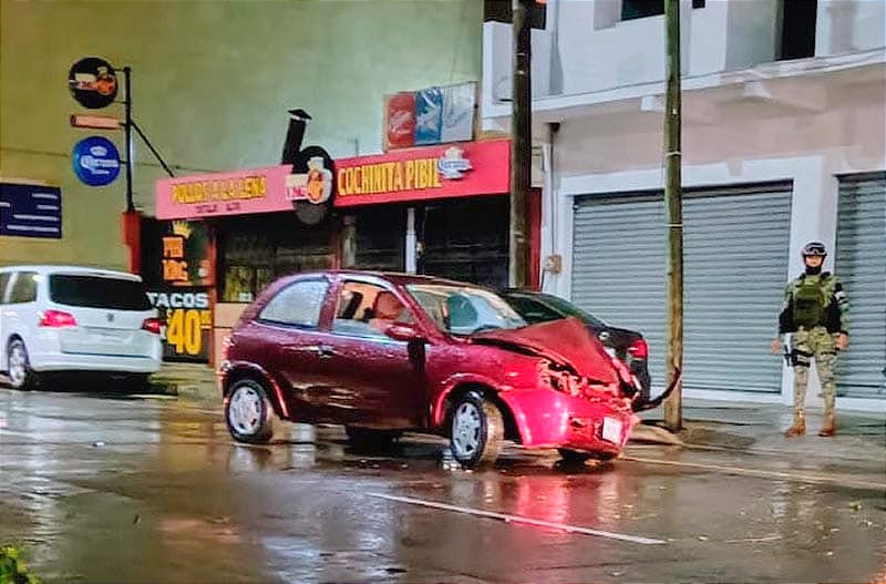 La velocidad y el piso mojado por la lluvia, la conductora no logró controlar la unidad, subiéndose al camellón, chocando contra una palmera y rebotando hacia la calle.