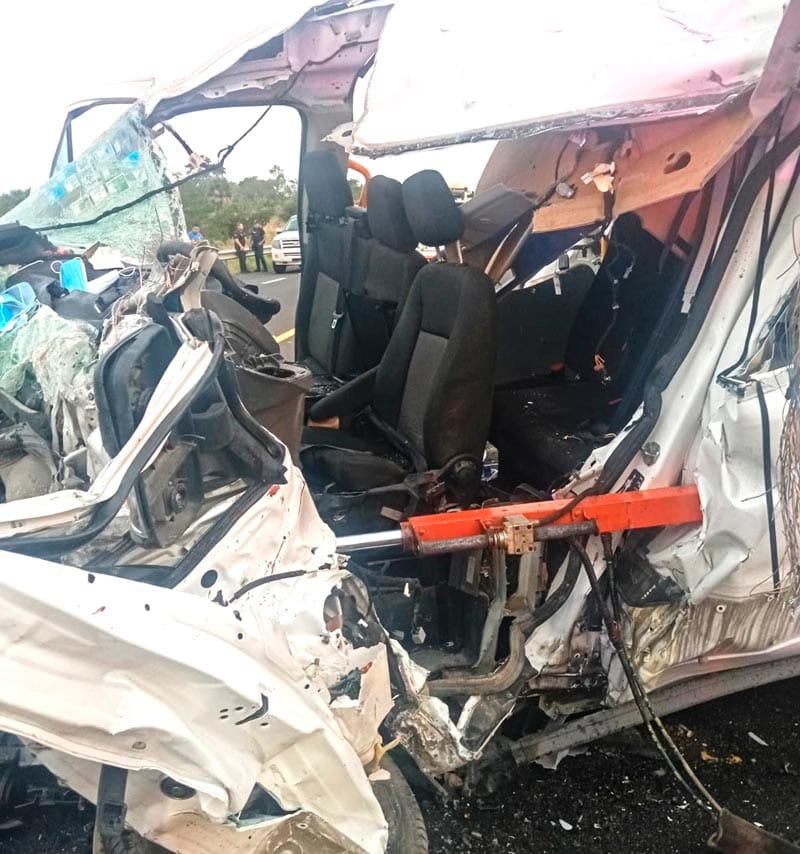 *En la camioneta Ford Transit murió el conductor al quedar prensado ademas de 13 heridos, se conoció que entre los pasajeros viajaba el suplente del alcalde de Álamo Ranulfo Hernández y de varios trabajadores del ayuntamiento quienes viajaban en dirección al Puerto de Veracruz para asistir al evento de la presidenta Claudia Sheinbaum