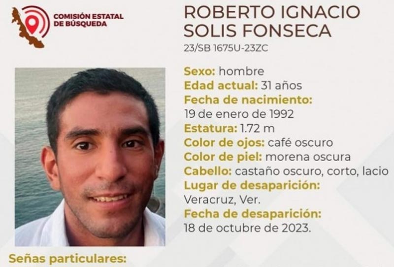 La ficha 23/SB 1675U-23ZC reporta la desaparición de Roberto Ignacio Solís Fonseca, de 31 años de edad, con quien se perdió contacto el pasado 18 de octubre de 2023 en Veracruz, Veracruz.