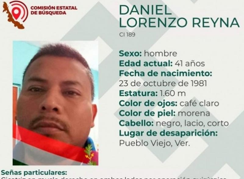 La ficha CI 189 reporta la desaparición de Daniel Lorenzo Reyna, de 41 años de edad, con quien se perdió contacto en 2019 en Pueblo Viejo, Veracruz.