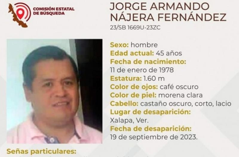 La ficha 23/SB 1669U-23ZC reporta la desaparición de Jorge Armando Nájera Fernández, de 45 años de edad, con quien se perdió contacto el pasado 19 de septiembre de 2023 en Xalapa, Veracruz.
