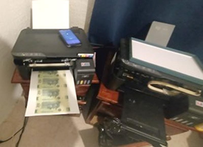 En lo que respecta en Veracruz, y como resultado de los cateos, se detuvo a Christian “N” en la ciudad de Coatzacoalcos, Veracruz, a quien se le aseguraron piezas de impresión de dinero falsificado de diversas denominaciones, hojas, papel de distinto numerario, dos teléfonos celulares y una laptop.