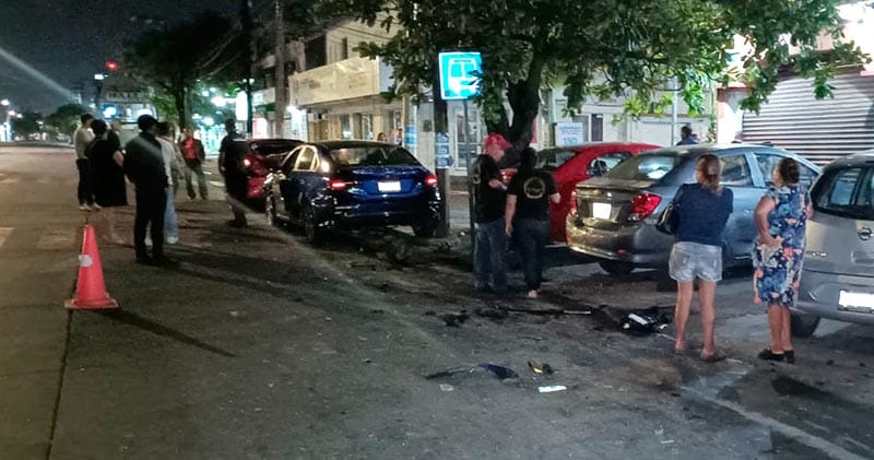 Ahí un automóvil de la marca KIA, de color azul, circulaba a muy altas velocidades, perdiendo el control y colisionando contra unos carros estacionados y otro que le antecedía, de la marca Ford, de color rojo.