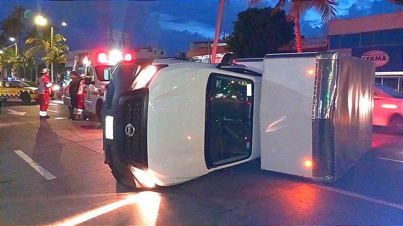 En céntricas calles de la ciudad de Veracruz, este fin de semana, hubo un percance entre una camioneta, tipo Van y una camioneta de paquetería, marca Nissan la cual quedó volcada sobre un costado, movilizándose personal de emergencia, policías y agentes de vialidad.