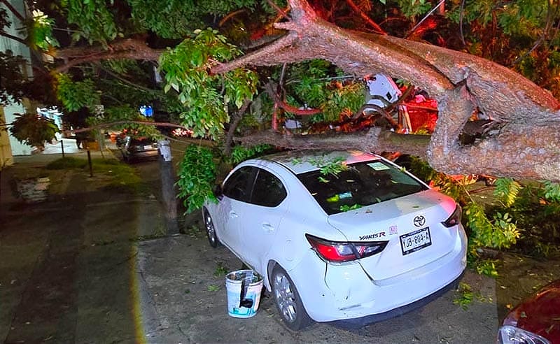 El camión de la basura se atoró con una rama de un árbol de mulato, ya dañado y hueco, tirándolo encima de unos carros.