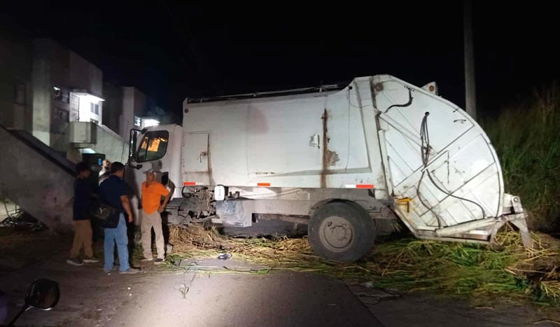 Un camión recolector de basura se cayó del puente vehicular que comunica al fraccionamiento Colinas de Santa Fe tras perder el control el operador de la pesada unidad, sin aplastar alguna persona o caerle encima a otro vehículo.