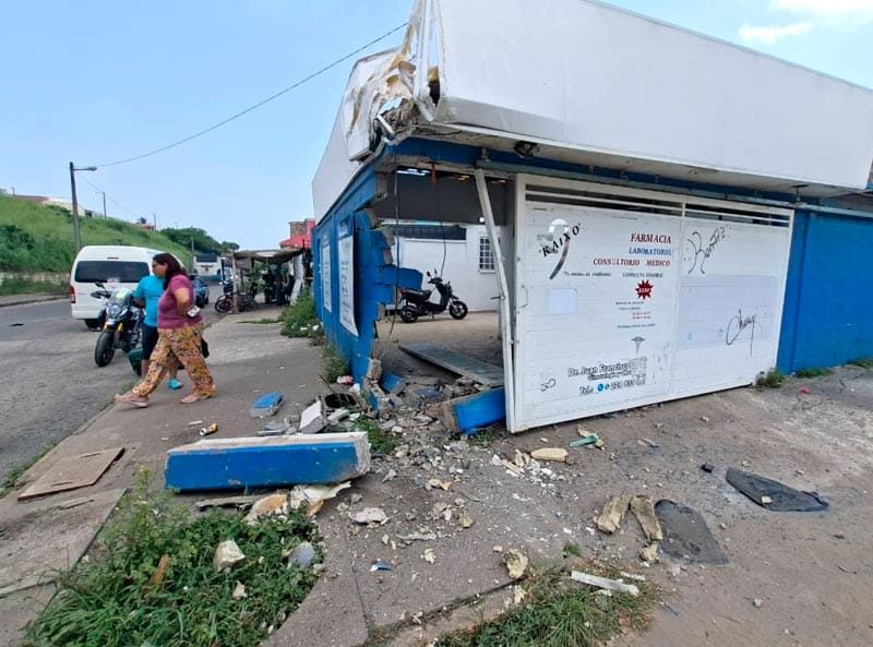 En calles del fraccionamiento Geo Los Pinos, en la zona norte de la ciudad de Veracruz, un camión de la ruta Herradura-Geo Villas Los Pinos con número económico 1466, se estrelló de reversa contra un laboratorio clínico, presuntamente por una falla mecánica.